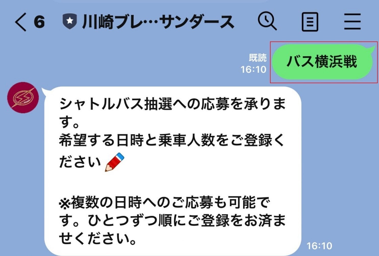 【2】トーク画面にキーワード「バス●●戦」と入力・送信してください。