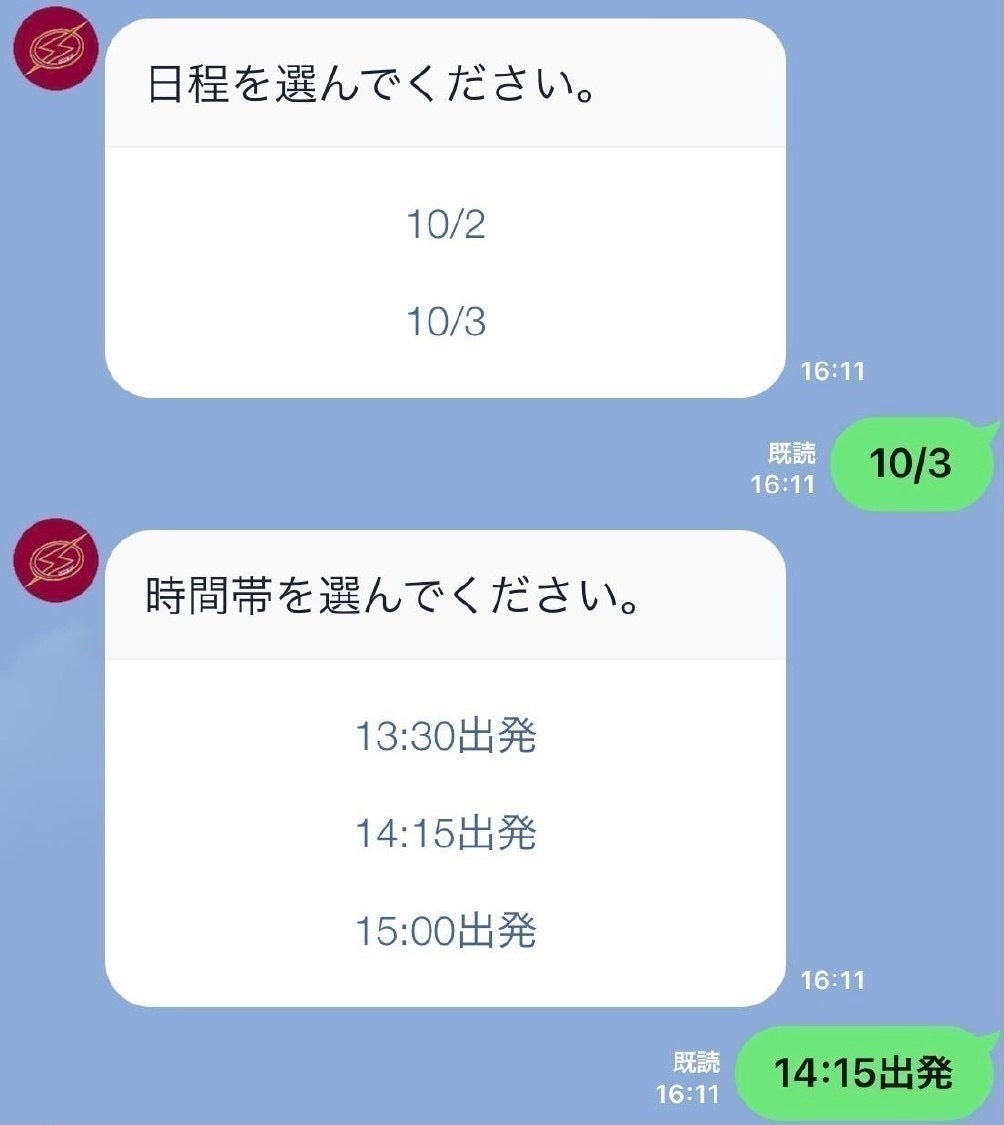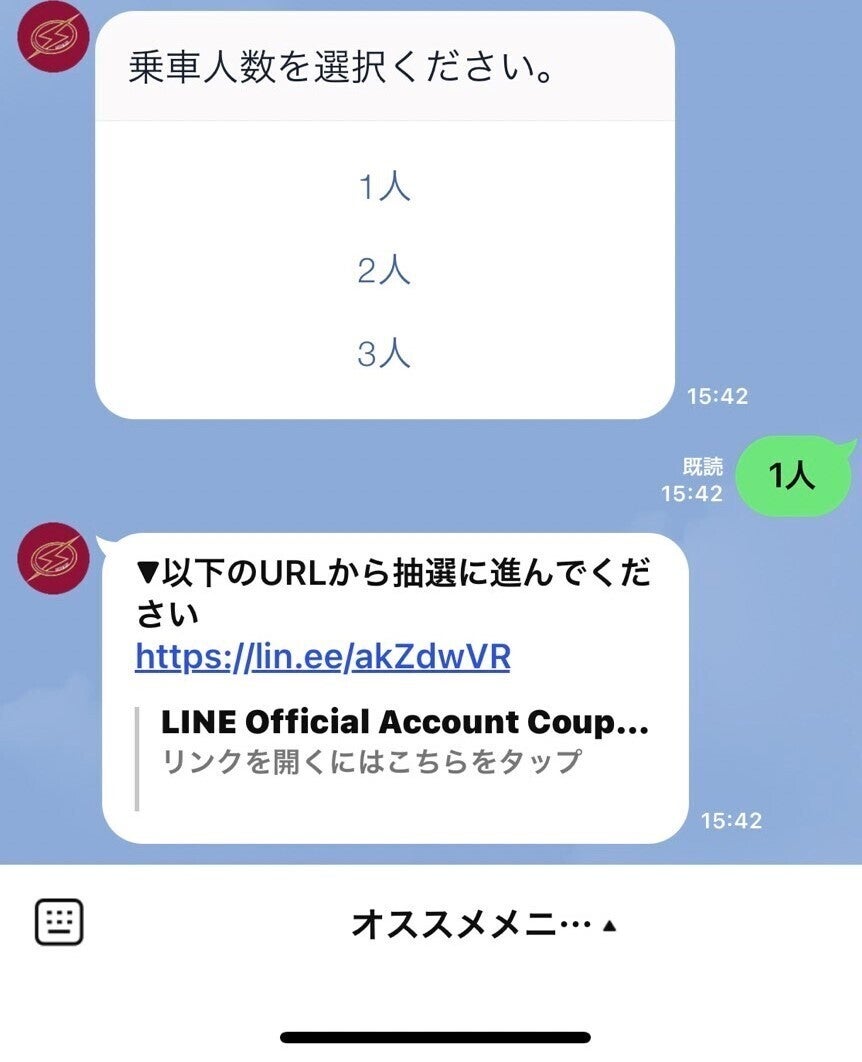 【3】トーク画面上の案内に従い、希望日時と乗車人数をご登録ください。(同時にお申込み可能な人数は3名までとなります)